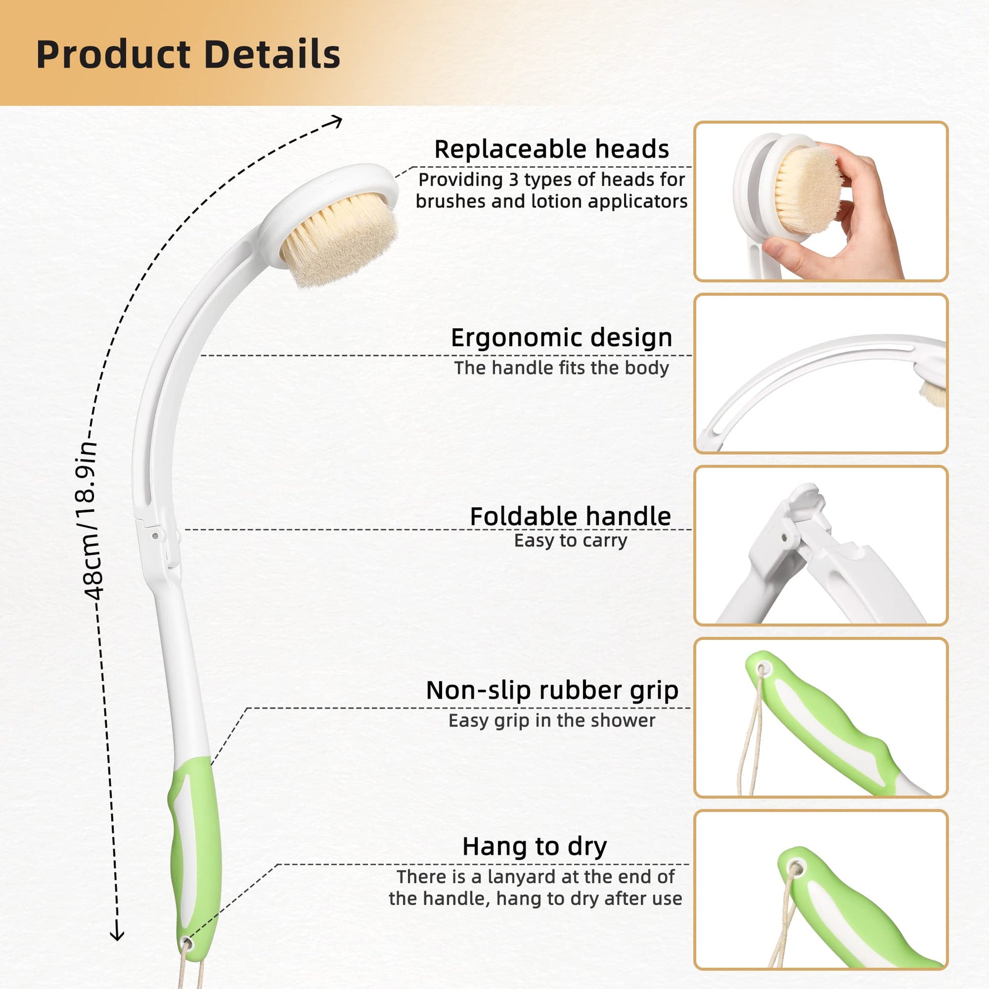 - ๐๐.๐๐ข๐ง ๐ ๐จ๐ฅ๐๐๐๐ฅ๐ ๐ฅ๐จ๐ง๐ ๐ก๐๐ง๐๐ฅ๐: The 18.9" long curved handle makes it easy to reach hard-to-reach areas of the back, without having to raise your arms very high! The handle design conforms to the curve of the body, more closely fit the back, more convenient operation, effectively help us easily clean all parts of the body. Handles can be folded, convenient for you to carry to the outdoors when traveling or fitness.