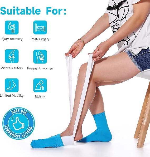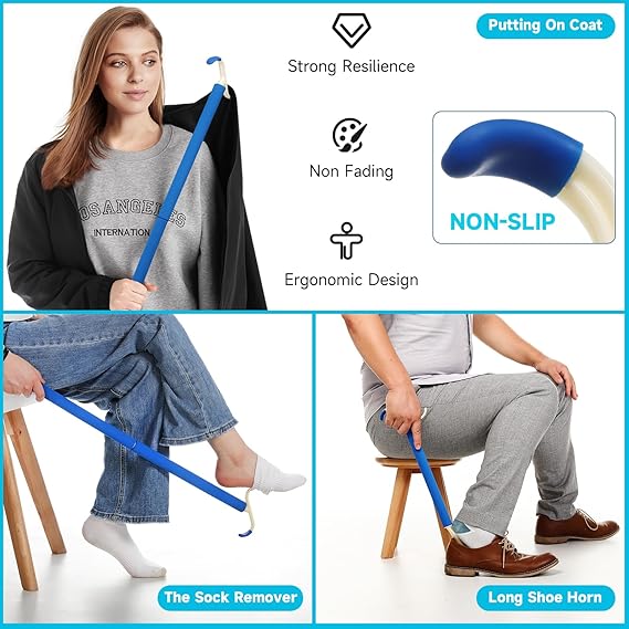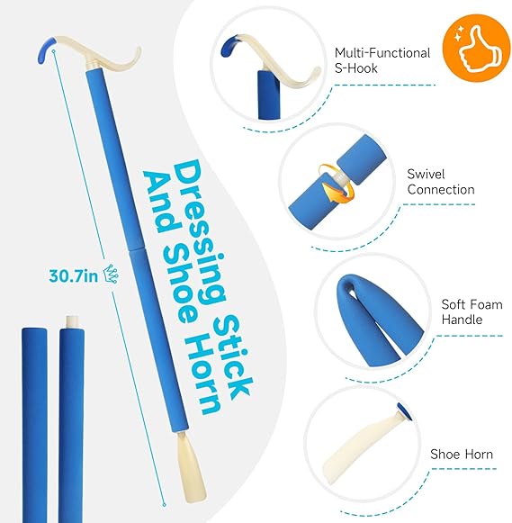 - 4-Piece items: Fanwer's sock aid foldable reacher grabber shoe horn dressing stick pants aid is designed to be a combo to enhance the independence and dignity of those who need assistance. As a combo of dressing aids tools, this set helps those who are recovering from hip or knee surgery, bariatric surgery and those suffering from limited movement abilities.
