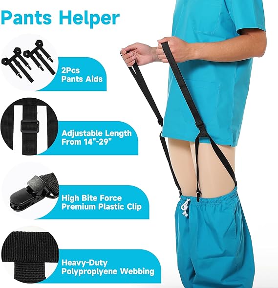- Pants aid tool: The pants aid tool has a clip-and-pull strap system with adjustable lengths from 26 inches to 41 inches.